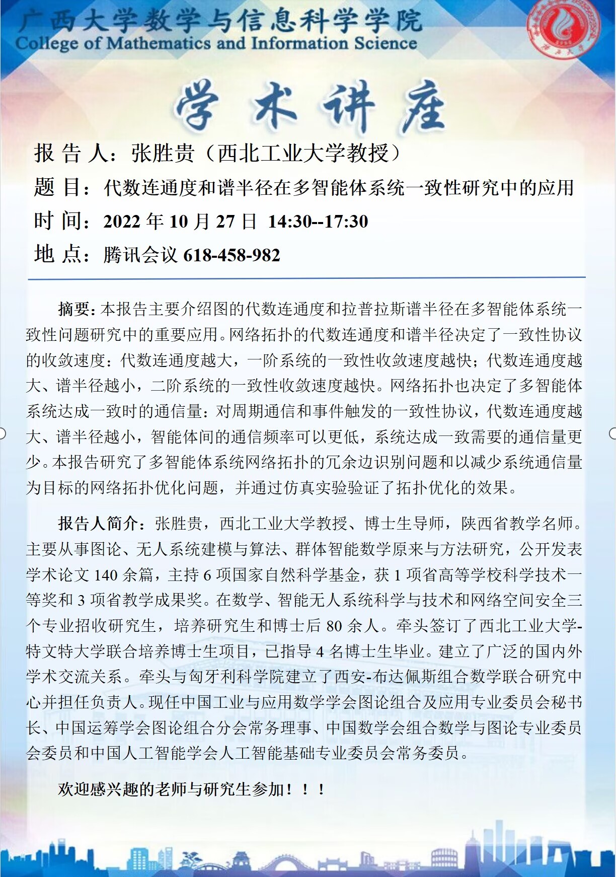 学术报告:代数连通度和谱半径在多智能体系统一致性研究中的应用