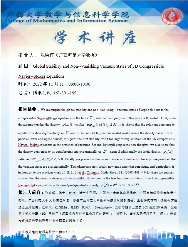 学术讲座:Global Stability and Non--Vanishing Vacuum States of 3D Compressible Navier- Stokes Equations
