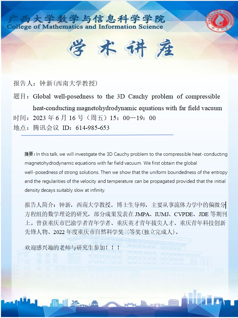 学术讲座:Global well-posedness to the 3D Cauchy problem of compressible heat-conducting magnetohydrodymamic equations with far field vacuum