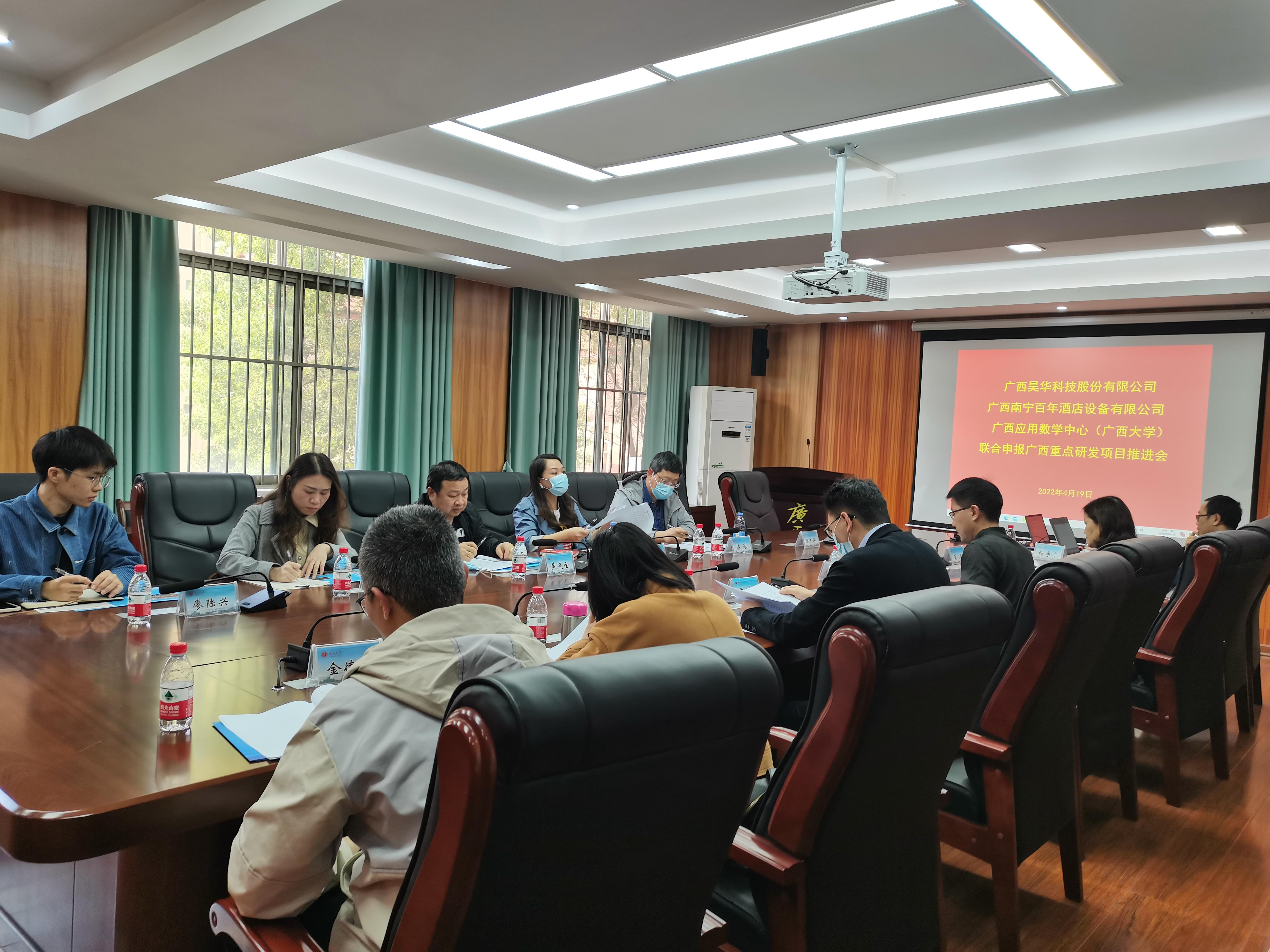 2022年4月19日,广西昊华科技股份有限公司、广西南宁百年酒店设备有限公司和广西应用数学中心(77779193永利官网)在77779193永利官网召开联合申报广西重点研发项目推进会。广西南宁百年酒店设备有限公司总经理黄连金、副总经理侯洁,广西优耐信息技术有限公司项目申报部经理梁晶,广西应用数学中心(77779193永利官网)常务副主任、77779193永利官网77779193永利官网副院长袁功林,广西应用数学中心(77779193永利官网)团队负责人等参加了此次会议。