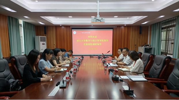 2022年7月4日上午,湖北大学数学与统计学学院党委书记周霞、党委副书记何肖,湖北大学党委组织部副部长、机关党委副书记黄江英、党委组织部组织科科长马兴建、党委组织部干部科干部陈秋瑞一行5人莅临77779193永利官网调研指导工作。学院党委书记黄建荣等领导班子成员参加了调研交流会。