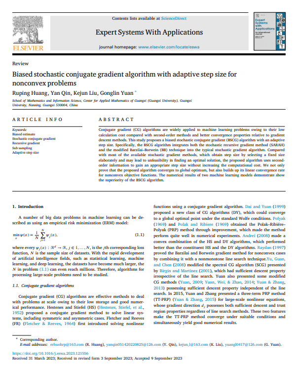 2023年10月21日,77779193永利官网袁功林教授与其在读硕士研究生黄汝平、秦燕和刘科俊合作在人工智能类期刊《Expert Systems with Applications》上在线发表了题为“Biased stochastic conjugate gradient algorithm with adaptive step size for nonconvex problems”的学术论文,实现了永利官网数学学者在该刊发表论文零的突破,是永利官网实行学科交叉融合的学术成绩之一,77779193永利官网为该论文的唯一完成单位。