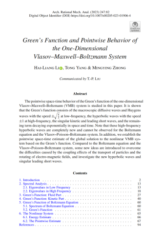 钟明溁教授及其合作者,2023年在玻尔兹曼方程格林函数的研究工作中取得了重要突破,研究成果“Green’s Function and Pointwise Behavior of the One-Dimensional Vlasov–Maxwell–Boltzmann System”以近百页的篇幅发表在应用数学著名学术期刊《Archive for Rational Mechanics and Analysis》上。《Archive for Rational Mechanics and Analysis》是中国数学会应用数学类T1期刊之一,在力学和分析领域有着悠久的历史,为学术界提供了众多数学和力学交叉领域的研究成果,此项工作是钟明溁教授就玻尔兹曼方程格林函数问题在该杂志发表的第二篇文章。