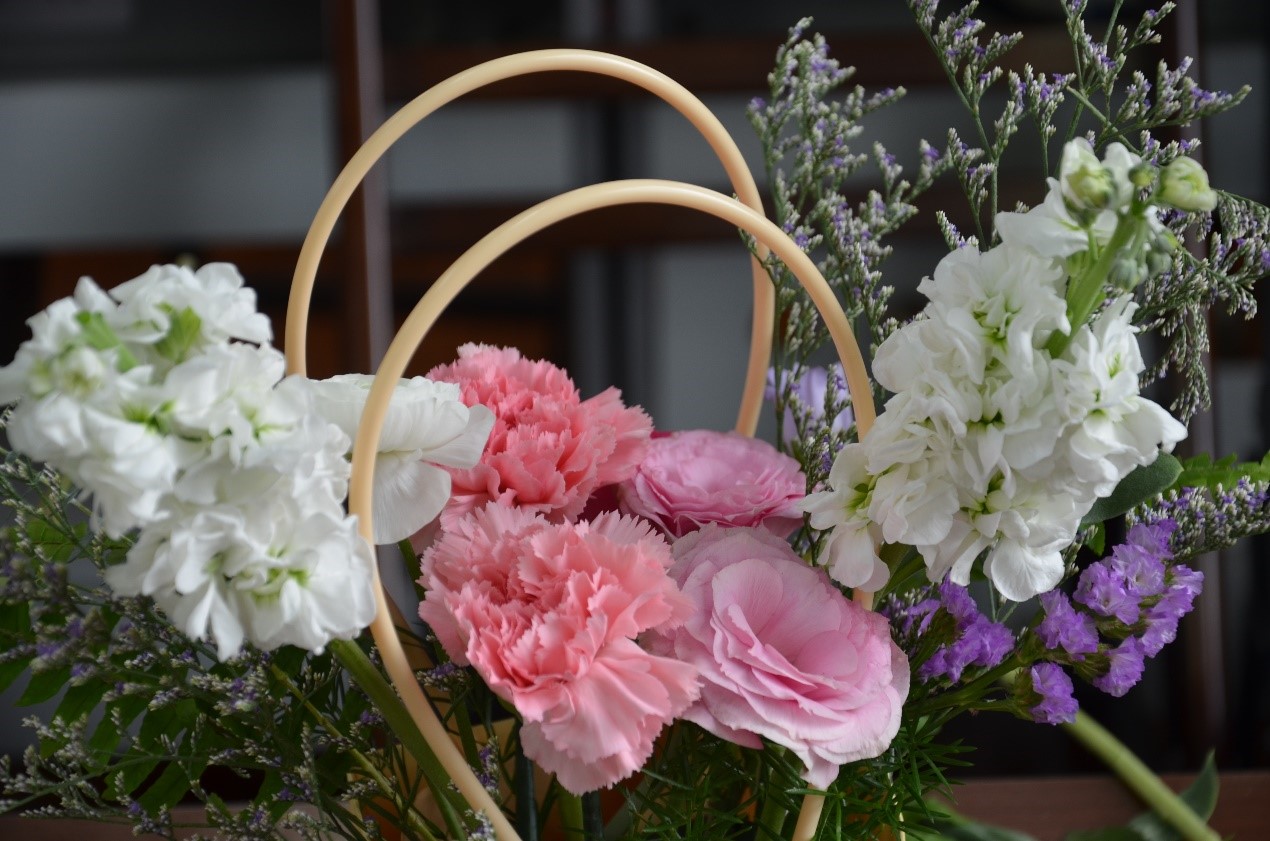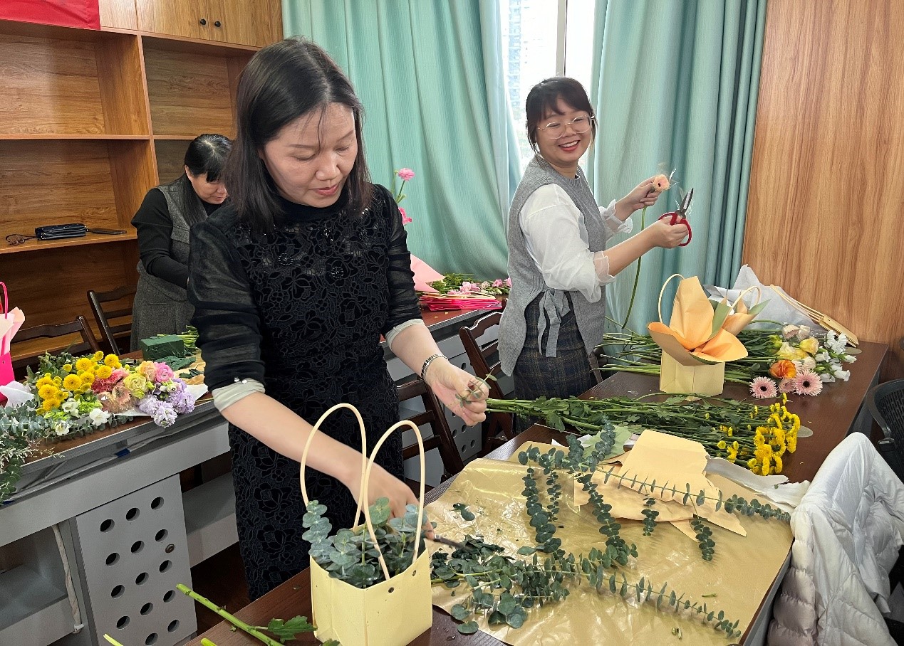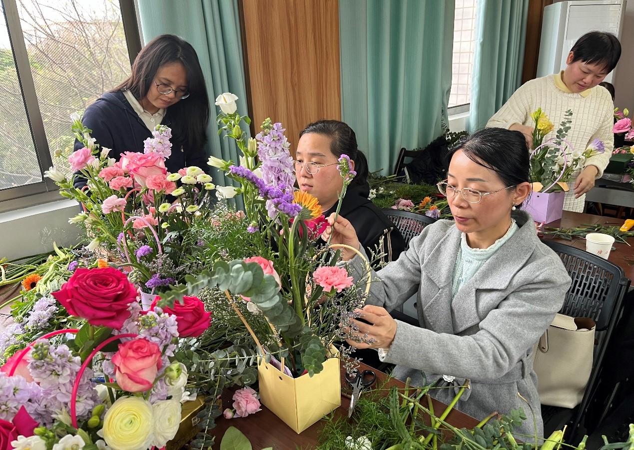 李林教授在花艺基础知识讲座中,从花材种类、颜色搭配、造型原理、作品鉴赏以及插花创作等方面为老师们科普鲜花花语和插花技巧,并现场展示经典插花造型。女教工们在老师的悉心指导下,大胆发挥自身想象力,根据手中的花材特点、颜色,创意修剪、搭配,每个人脸上都洋溢着幸福快乐的笑容,在轻松愉快的氛围中感受插花艺术的魅力,一束束错落有致、创意十足的“私人定制”花艺作品在老师们手中被赋予了新的芬芳。