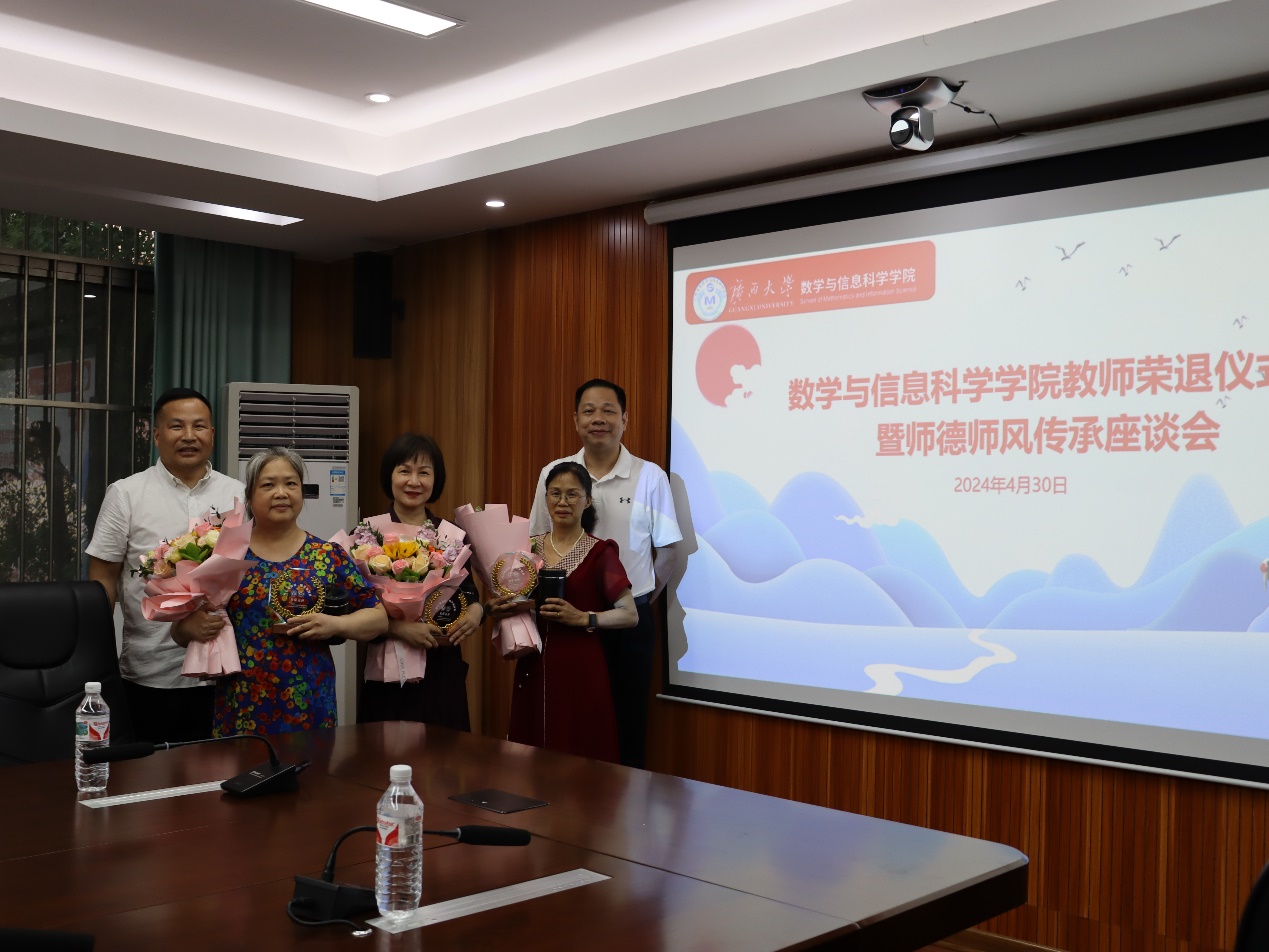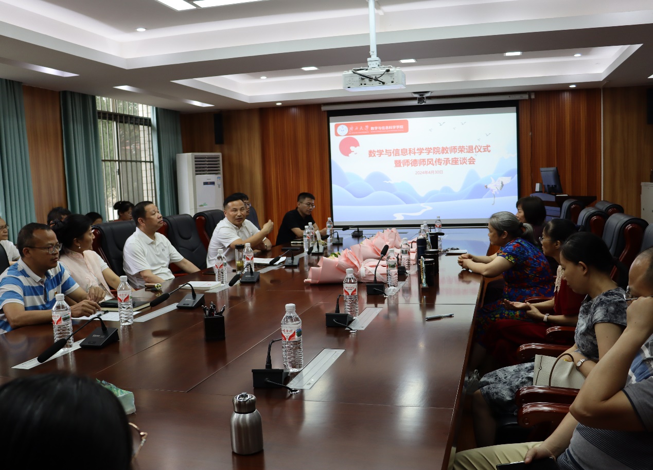 覃宪儒代表学院党委对荣退教师们为数信学院各项事业发展的辛勤耕耘和无私奉献表示感谢。他指出,荣退教师在过去的几十年里,始终站在立德树人、教书育人、服务师生、奉献社会的前沿,以职业为荣,以立德树人为己任,淡泊名利,培根铸魂,点亮了学生成长成才之路;潜心教学科研,倾心管理服务,不忘初心、牢记使命,为学院的发展打下了坚实基础。“莫道桑榆晚,为霞尚满天”,也希望退休教师们一如既往地关心支持学校发展,积极建言献策,发挥余热,贡献智慧。