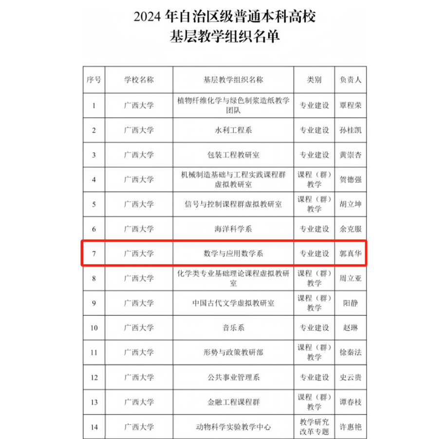 近日,自治区教育厅公布2024年自治区级普通本科高校基层教学组织名单,77779193永利官网申报的数学与应用数学系获认定为自治区级普通本科高校基层教学组织。