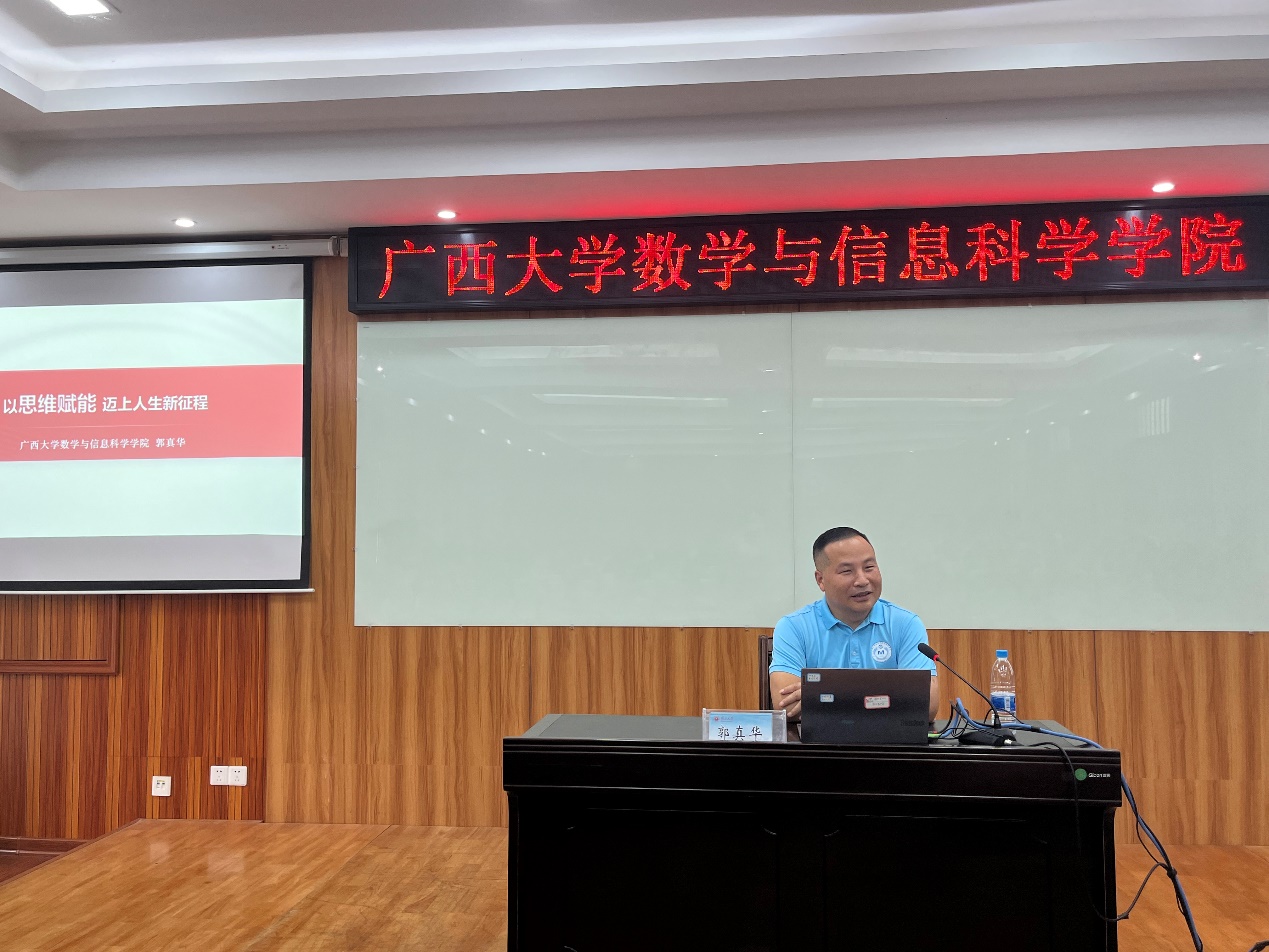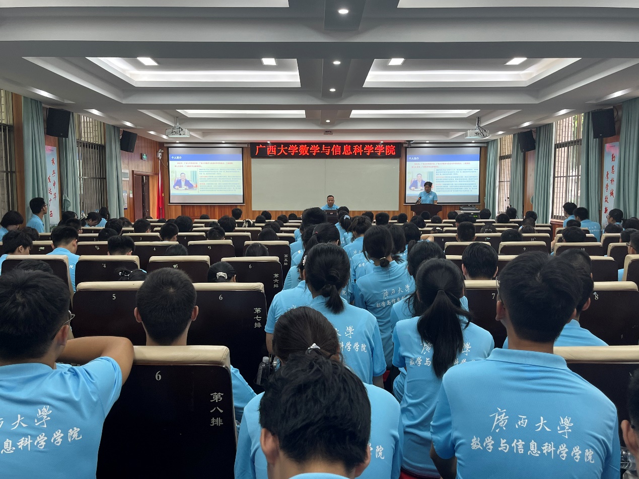 郭真华从大学是什么、我们的大学、我们的专业、我们的学习等四个维度展开讲授。他指出,“大学之“大”,在于学问之大,知识之大,在于求学之深与广,在于有大师也。他带领同学们回顾了77779193永利官网建校96年的校史脉络,从梧州立校到桂林兴校,从榕江避难到南宁复校,再到后来的两校合并以及入选国家“双一流”建设高校,用一幅幅图片、一组组数据为同学们再现了77779193永利官网的发展历程和取得的优异成绩,引导同学们深入认识和了解学校,树立爱校荣校的家国情怀和责任担当。接着,他又向同学们讲述了77779193永利官网的发展历程,并从何理解大学里的数学教育的角度为同学们剖析了大学数学和中学数学的不同之处和树立数学思维的重要性。最后,他鼓励同学们脚踏实地,多问善思,敢于追梦,努力成长为又博又专、愈博愈专的新时代人才。