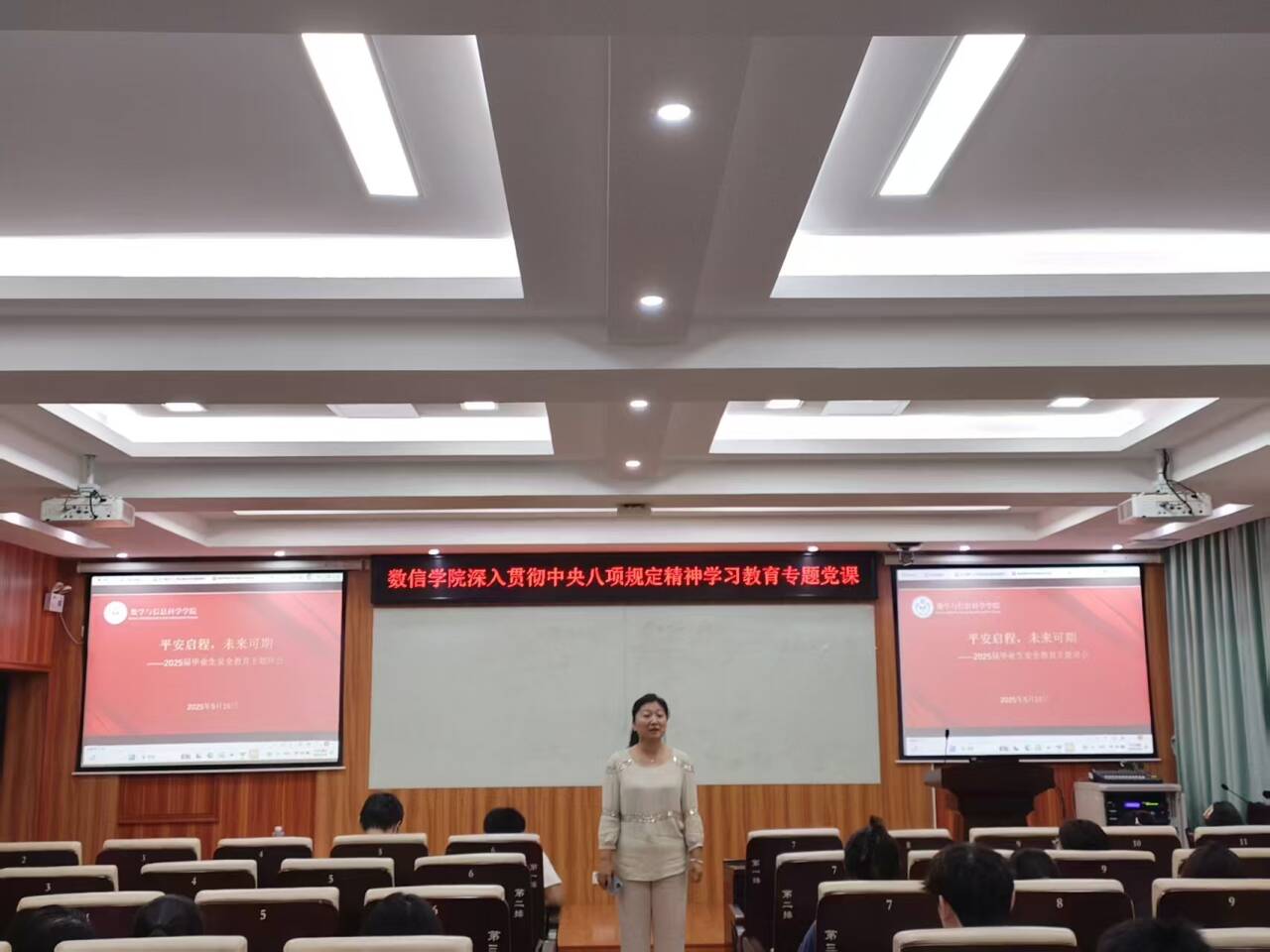 吴华丽首先向圆满完成学业的毕业生党员表示祝贺,并对他们未来的发展寄予厚望。党课上,吴华丽强调,党员身份不仅是荣誉,更是责任,毕业生党员即将步入社会,面临全新挑战,要时刻保持政治敏锐性,做到“勤”“严”“实”“新”,深入学习贯彻习近平新时代中国特色社会主义思想,以党的创新理论武装头脑,不断提升政治素养,在复杂多变的环境中坚守正确政治方向,维护党的形象。