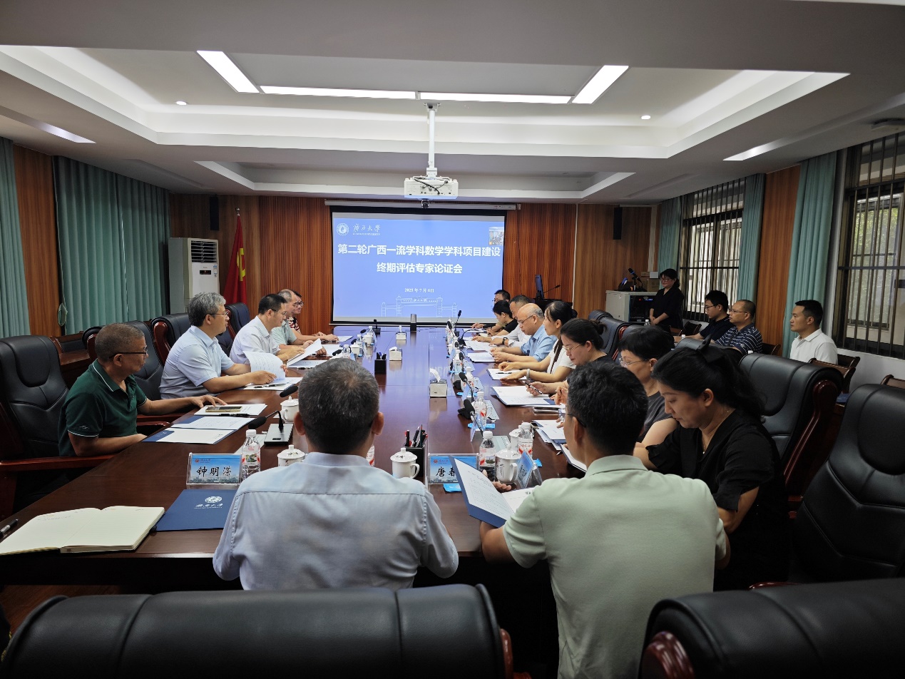 数学学科负责人郭真华从学科建设总体情况、学科建设进展成效、亮点与标志性成果、存在问题与改进措施四个方面向专家组详细汇报了数学学科在第二轮广西一流学科建设期间的情况,重点汇报了学科在人才培养、教学能力、科学研究、人才引进、社会服务、国际交流等方面取得的进展与成果。