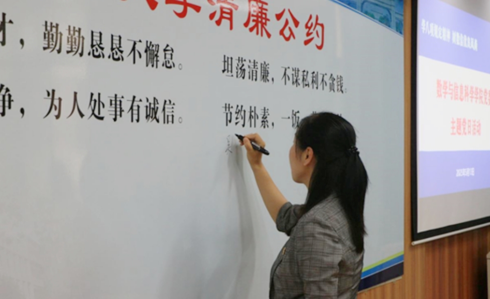 廉洁诚信,清廉公约签名倡议。学院纪委委员、教师党员代表韦琳娜和学生党员代表周培烽分别宣读了“学中央八项规定精神 树数信优良风尚”倡议书,倡议学院师生以实际行动践行中央八项规定精神,从自身做起、从现在做起,共同树立数信优良风尚。随后,参加活动的师生党员依次在77779193永利官网清廉公约展板上签名承诺,践行清廉公约。