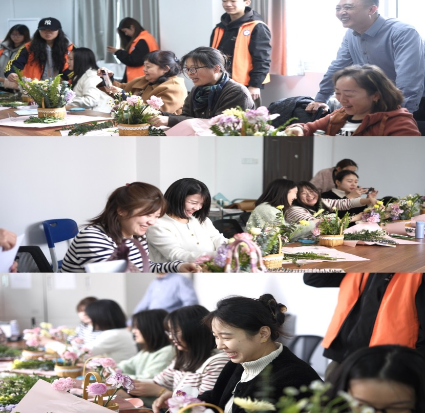 在花艺师的指导下,女教职工们充分发挥自己的创意和想象力,精心挑选花材,认真构思造型,细致修剪枝叶,将一朵朵鲜花错落有致地插入花篮中,创作出了一件件独具匠心、赏心悦目的插花作品。大家在创作过程中互相交流心得,分享插花的乐趣,现场充满了欢声笑语。