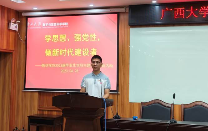 为深入开展学习贯彻习近平新时代中国特色社会主义思想主题教育,教育引导毕业生党员增强组织观念,以健康文明方式告别母校,激励毕业生党员走上新的岗位后继续发挥党员先锋模范作用,在“七一”建党节即将来临之际,6月25日上午,学院党委面向2023届毕业生党员开展了以“学思想、强党性,做新时代建设者”为主题的党性教育活动。数信学院党委书记黄建荣,党委副书记郭海燕出席了活动,学院有毕业生党员的支部书记、全体毕业生党员参加了活动。